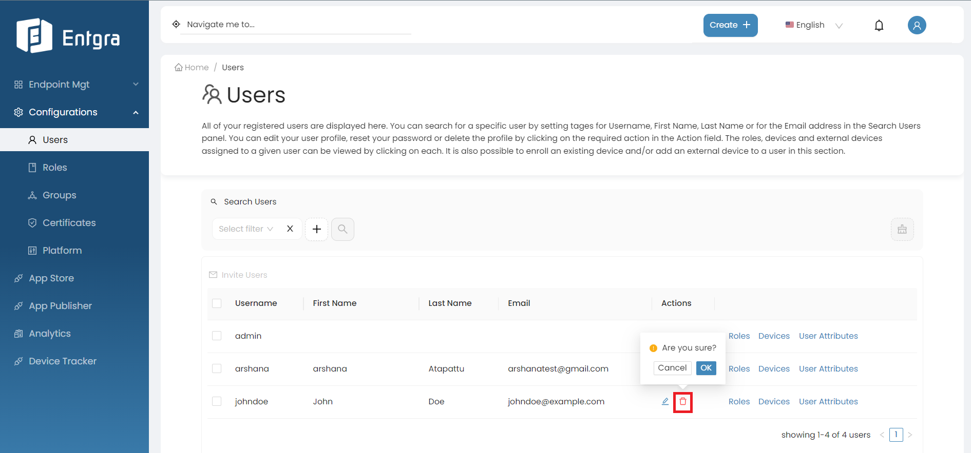Users are the people who interact with Entgra UEM Server. Users can belong to either the administrator or user role type. The super tenant administrator and a tenant administrator belongs to the administrator role type; while, all other end-users belong to the user role type. The organization does not need to add users manually, if Entgra UEM Server is connected to a user store. UEM Server users are not allowed to edit user details once they have been added. You need to delete the current user and create a new user, if the need arises to change user details.